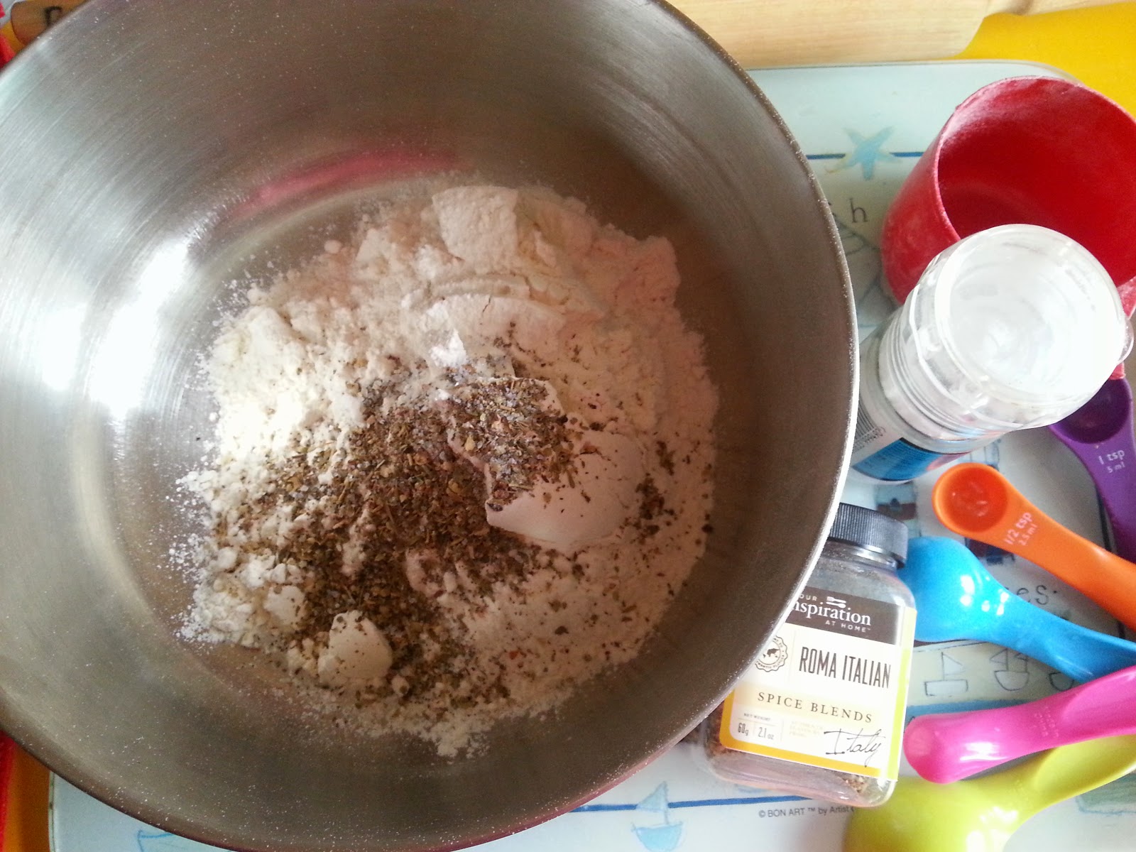 •In a large bowl, mix flour, salt and herbs then add yeast mix, combine well. If mixture doesn't combine, stir in additional water, 1 tablespoon at a time, until all of the flour is absorbed.